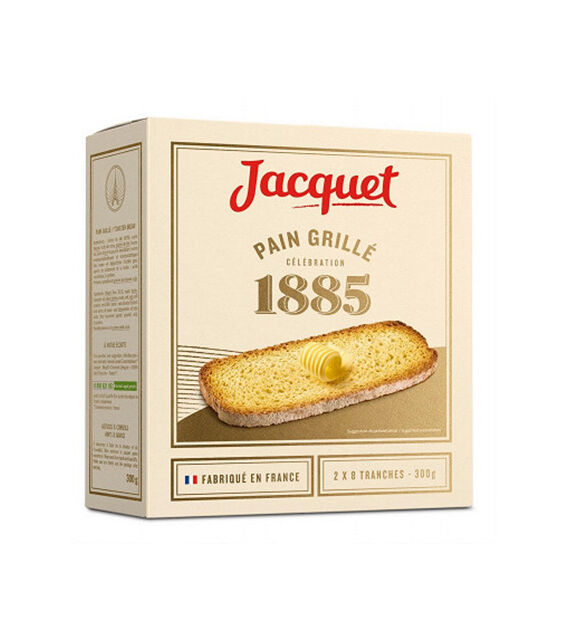 2 cases of 8 slices of Toasted Bread 1885. Emblematic and historical know-how of the Jacquet brand, the 1885 Toasted Bread is ideal to accompany all your meals, in sweet, savory or both versions!